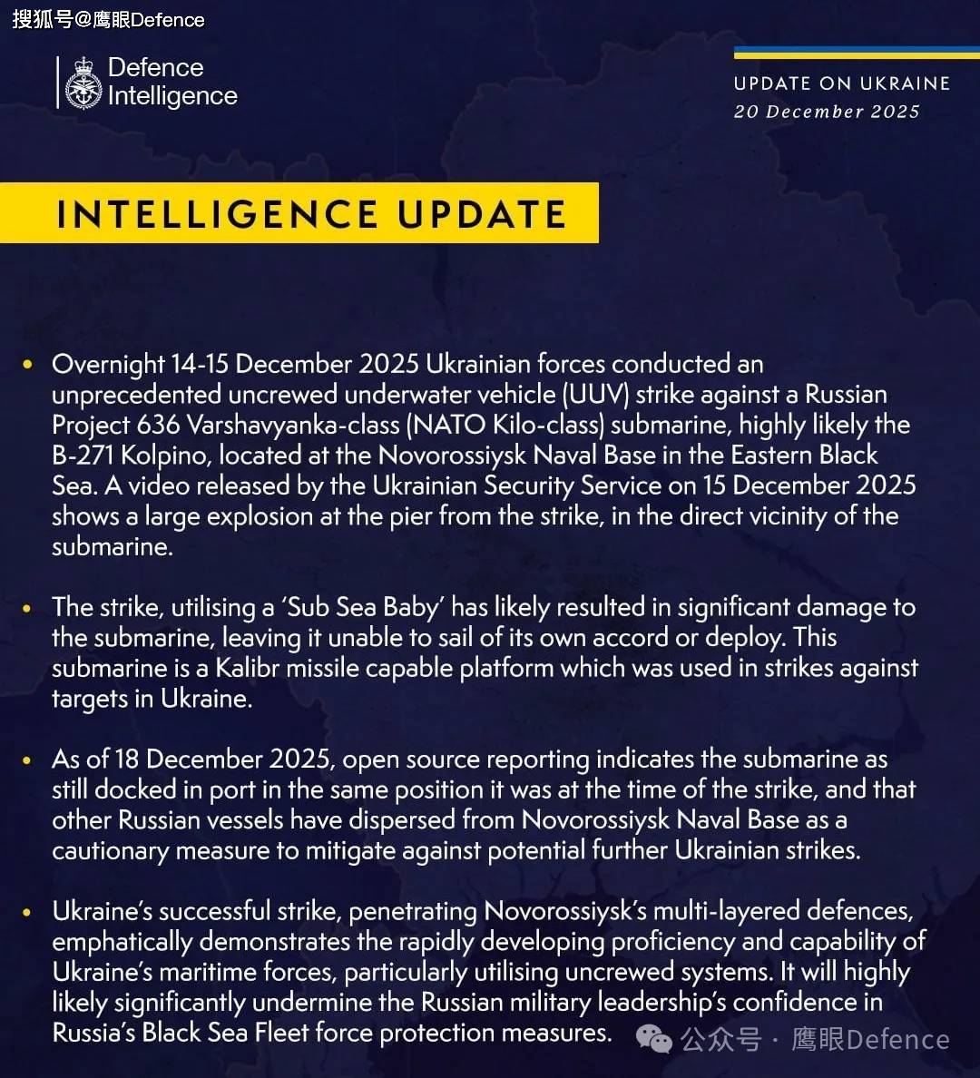 英国情报部门评估认为,打击造成这艘俄罗斯潜艇无法自主航行,也不再能执行向乌克兰发射“口径”巡航导弹的任务。