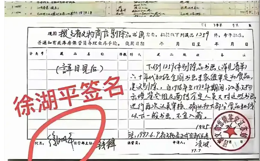 但有意思的是,1997年5月8日,一份文物拨交凭证上,副院长徐湖平签下名字,批准将包括《江南春》在内五件古画,从南博拨至“江苏省文物总店”。