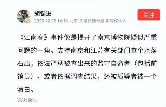 连胡锡进都忍不住说话了:"《江南春》事件像是揭开了南京博物院疑似严重问题的一角,支持有关部门查个水落石出,依法严惩被查出来的监守自盗者。"