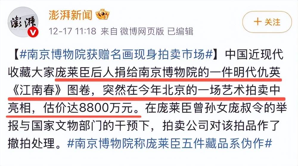 庞家后人本就对这件事非常愤怒,没想到,他们今年在拍卖会中发现了捐赠的明代仇英的《江南春》,现场估价为8800万元。