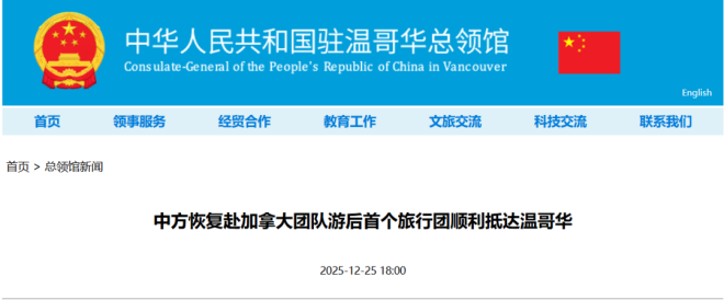 12月26日,中国驻加拿大使馆发布《提醒来加团队游中国公民注意旅行安全》的通知,通知指出中国已恢复旅行社经营中国公民赴加拿大团队游业务。