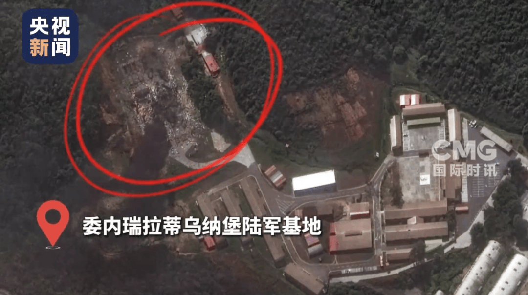 ▲委内瑞拉蒂乌纳堡陆军基地受损卫星图 央视新闻截图