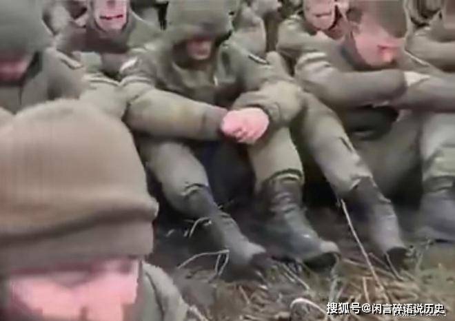 画面中的大批俄军士兵正蹲在地上投降,挨个等待乌克兰的审讯。