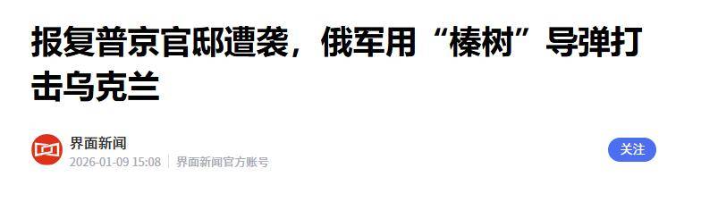 信息来源:报复普京官邸遭袭,俄军用“榛树”导弹打击乌克兰 界面新闻 2026-01-09 15:08