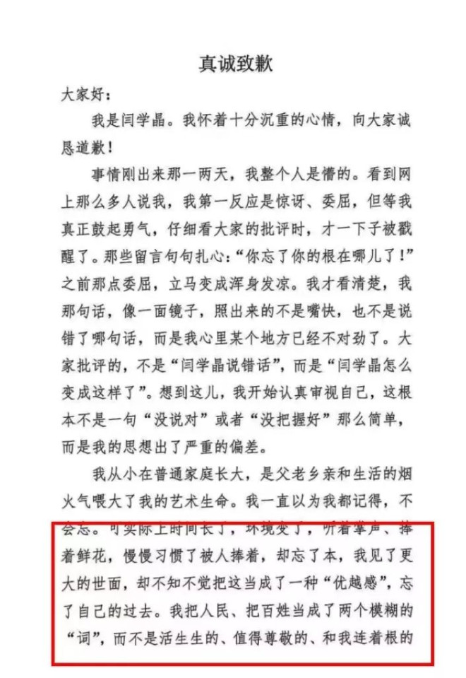 闫学晶深夜在朋友圈道歉,表示心情十分沉重,向大家诚恳道歉。闫学晶没有解释,更多是自我剖析,看来她可能得到高人指点。