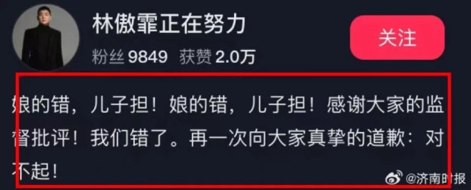 林傲霏随着闫学晶的道歉,他也在社交账号发文道歉,表示娘的错,儿子担!感谢大家的监督批评,他们错了,再一次向大家真挚的道歉,对不起!