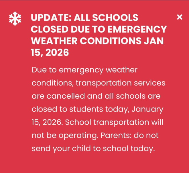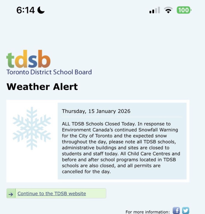 教育局补充说明:“由于恶劣天气,HWCDSB 旗下所有学校、成人教育中心、校内托儿中心、行政建筑及社区使用项目于 2026 年 1 月 15 日关闭,学生交通服务取消。教师将于上午 10 点前发布异步学习材料。”