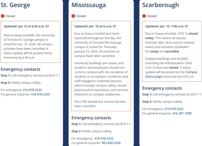 多伦多大学官网通知,多大三个校区于1月15日全天关闭。关闭期间,校内所有建筑物关门,学生和员工不要进入校区。