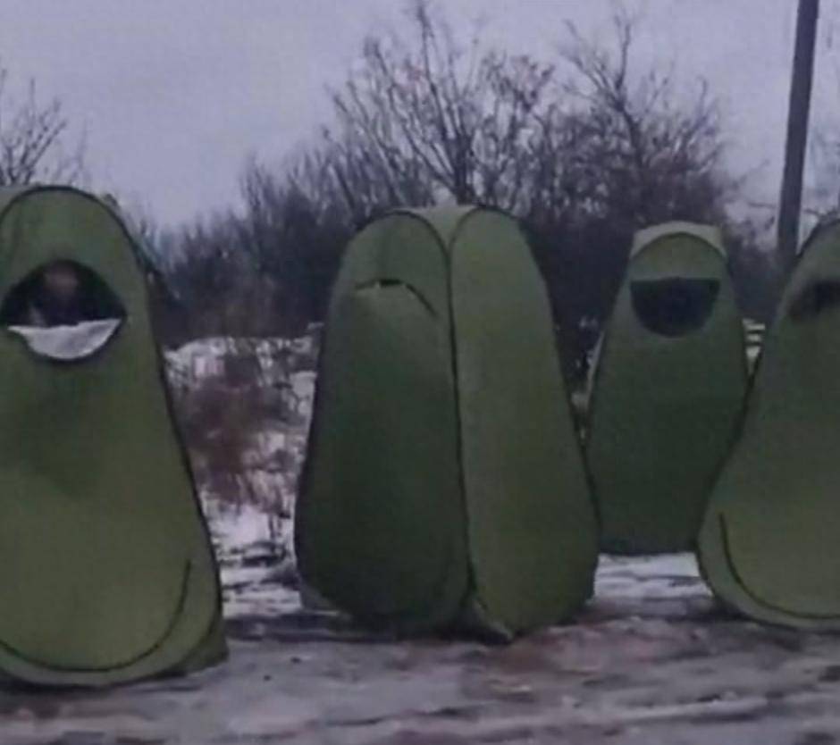 一段来自乌克兰被占领土前线的视频显示,在零下14摄氏度的冰封土路旁,至少六七名普京的士兵蜷缩在单薄的绿色隐私帐篷里。