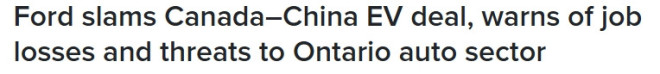 福特认为,该协议在未确保中国在加拿大汽车产业、供应链或更广泛经济领域进行对等投资承诺的情况下,打开了低价中国电动车大量涌入的大门。