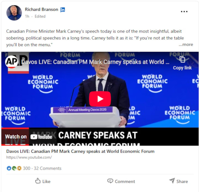 英国商业大亨Richard Branson在LinkedIn上写道:“加拿大总理卡尼今天的演讲,是我很长时间以来听到的最有洞见、也最令人警醒的政治演讲之一。他直言不讳地指出现实:‘如果你不在谈判桌上,就会出现在菜单上。’”