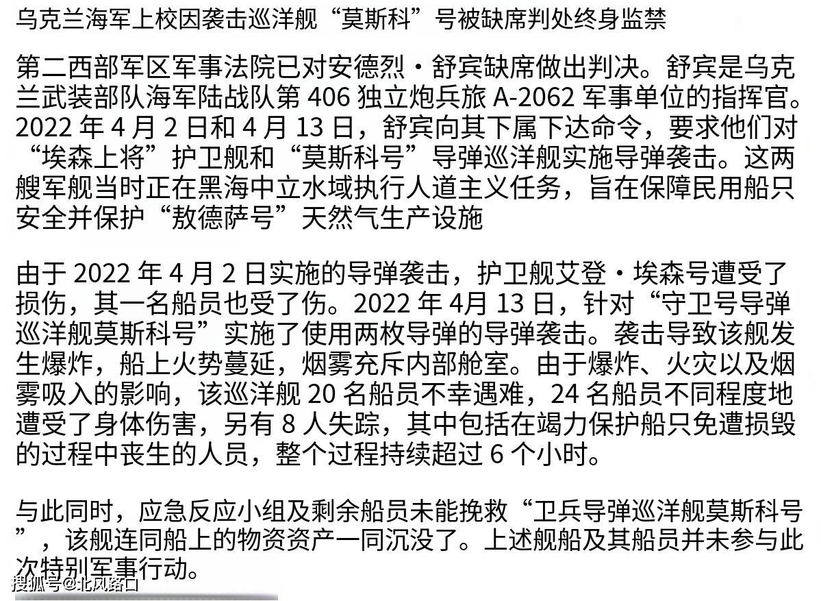 2026年1月23日,俄罗斯法院首次承认,乌克兰海王星导弹于2022年击沉俄黑海舰队“莫斯科”号巡洋舰,造成20名俄军水兵死亡,24人受伤,8人失踪,乌克兰旅指挥官被缺席判处终身监禁。