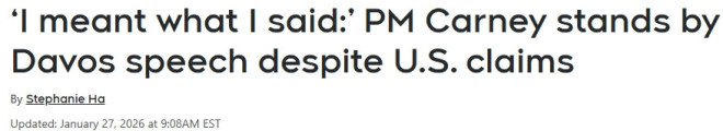 “我要非常明确地说,我也亲自对总统说过:我在达沃斯说的话,就是我本意。”卡尼表示,“那番话很清楚。核心是在更广泛的层面上指出,加拿大是第一个意识到美国贸易政策已经发生变化的国家,我们正在对此作出回应。”