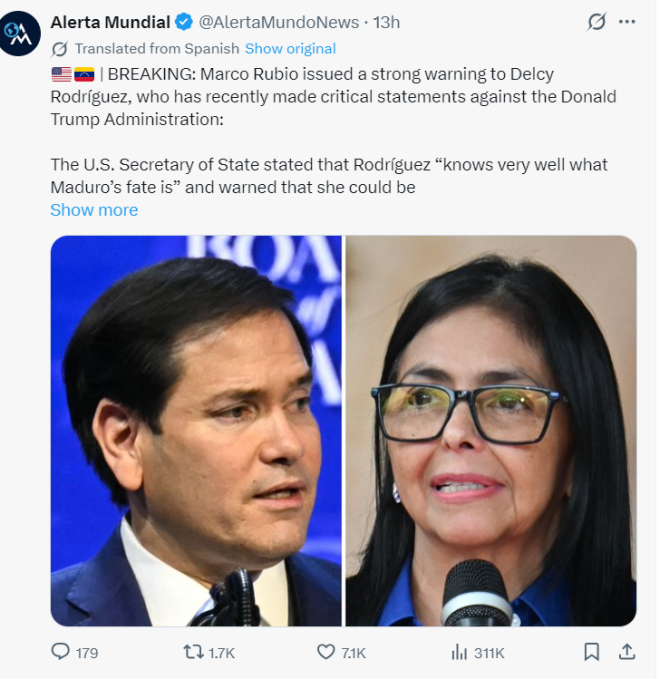 根据事先准备好的证词内容,卢比奥将在联邦参议院外交关系委员会上表示,曾任委内瑞拉副总统、目前担任代理总统的罗德里格斯(Delcy Rodríguez)“非常清楚马杜罗的下场”。