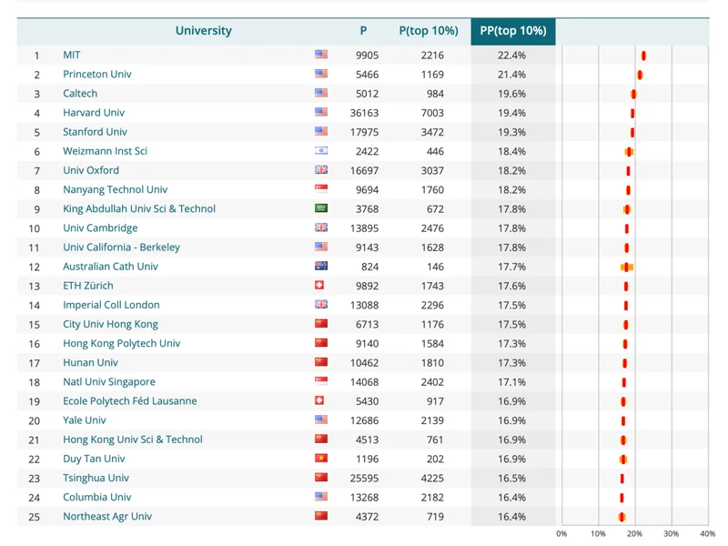 如果将排名参数改为PP(top 10%),也就是按照领域内前10%论文的数量占比排名,那么前三名分别是美国麻省理工学院、普林斯顿大学和加州理工学院。排名前10没有中国大学,排名前25也只有6所大学。中国大学排名最高的是香港城市大学,内地排名最高的是湖南大学。清华大学位于第23名,北京大学位于第102名。