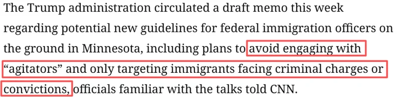 知情官员透露,1月29日特朗普(专题)政府发布了一份草案备忘录,拟为明尼苏达州的联邦移民官员制定新的指导方针。其中包括避免与“煽动者”接触,并仅针对面临刑事指控或定罪的移民。