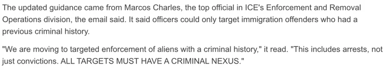 “我们将转向针对有犯罪记录的移民的重点执法。这包括逮捕,而不仅仅是定罪。所有目标都必须与刑事案件相关”,方针中指出。
