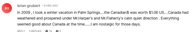 “2009 年,我在棕榈泉度过了一个冬季假期……当时加元兑美元汇率为 1.06。那时,在哈珀先生和弗莱赫蒂先生稳健、低调的领导下,加拿大平稳发展,经济稳健,一切都显得那么美好……我对那个时期充满怀念。”