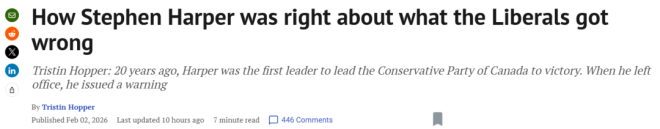 “哈珀无疑是近年来最称职的总理。在他的领导下,加拿大在 2008-2009 年全球金融危机中经济表现优于世界上任何其他国家。哈珀先生全心全意为国家奉献,与特鲁多和卡尼形成鲜明对比——后两者更多追求名声和个人光环。特鲁多和卡尼注重拍照留念、空洞演讲,不断告诉加拿大人‘我们会支持你们’,可如今,我们却承担着他们留下的债务与通胀后果。我无法断言哈珀若在疫情期间执政会如何应对,但有一点我可以确定:现如今,我们绝不会陷入如此困境。斯蒂芬·哈珀,许多加拿大人至今仍在怀念您。”