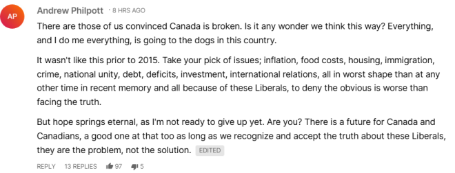 “这篇文章完全可以作为报纸的一整版内容。我们这些从未投票给特鲁多,也从未支持他任何主张的人,对于文章中列举的每一项政策都感到惋惜——完全在意料之中:哈珀推行的是稳健的政策和立法,旨在给社会带来具体利益;而特鲁多则逐一推翻,并在相反方向上加码,对社会造成负面影响。