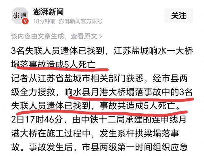 盐城大桥垮塌致 5 死后续 原因疑曝施工方被扒果然不简单
