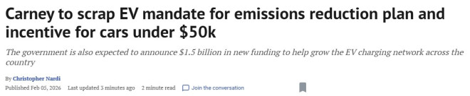 加拿大总理卡尼(Mark Carney)今天宣布取消前杜鲁多政府推行的备受争议的电动车强制销售政策,改为到2035年尾气排放减少75%为目标,并推出一项针对售价低于5万加元电动车的新购车补贴。