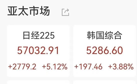 日韩股市大涨,日经225飙涨5%创新高,软银涨超7%,三星电子涨超5%
