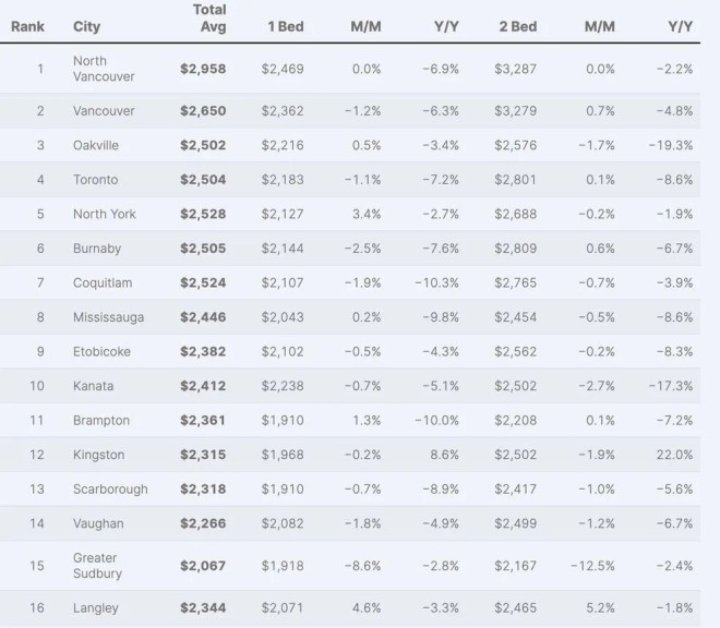 最大6个房市的加拿大平均公寓房租金排名中,BC省还有三个城市跻身租金最贵的前五名,分别是列治文(2643加元)、高贵林(2502加元)和本拿比(2483加元)。
