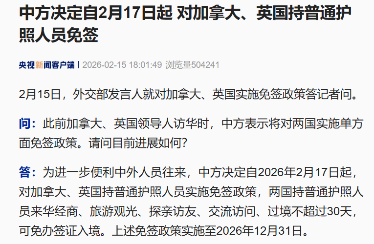 答:为进一步便利中外人员往来,中方决定自2026年2月17日起,对加拿大、英国持普通护照人员实施免签政策,两国持普通护照人员来华经商、旅游观光、探亲访友、交流访问、过境不超过30天,可免办签证入境。上述免签政策实施至2026年12月31日。