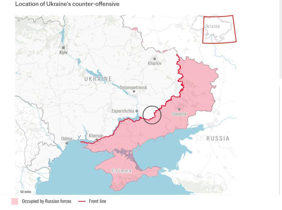 地图显示,在特尔努瓦特、多布罗皮利亚和扎利日奇内附近,靠近第聂伯罗彼得罗夫斯克-扎波罗热边界,乌克兰军队在反攻中突破了俄军防线。