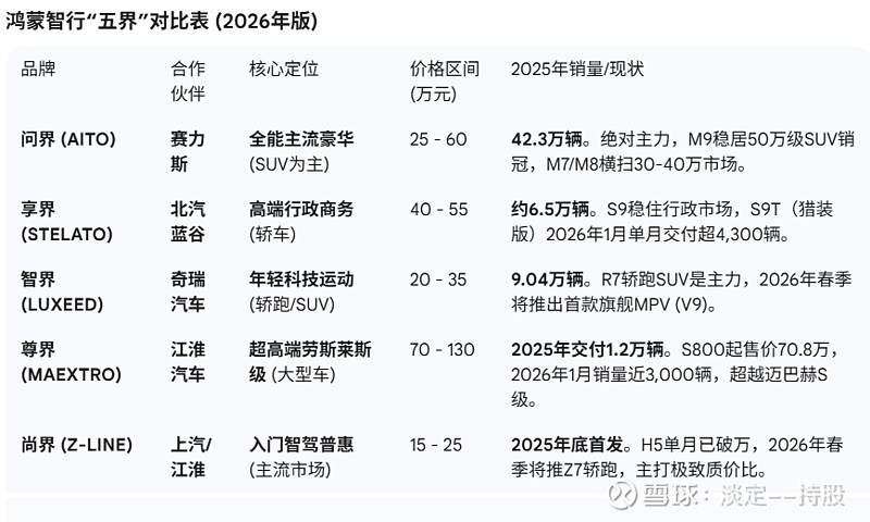 到 2026 年初,华为的汽车朋友圈已经形成了明确的三个等级,被称为“一塔(阿维塔)、三境(奕境/启境/享境)、五界(问界等)”。