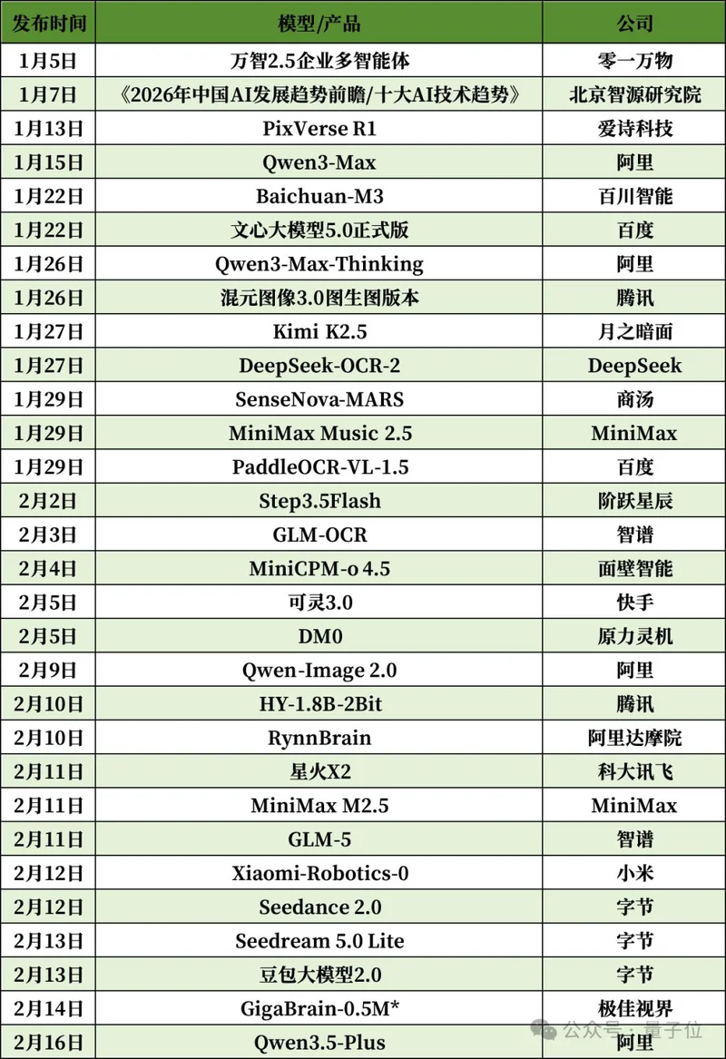 在中国这头,据量子位不完全统计,仅1月1日至除夕,国内公开宣发、具有行业影响力的AI模型技术迭代已超过30起。47天30次重磅发布,意味着平均每1.5天就有一个新模型现世。