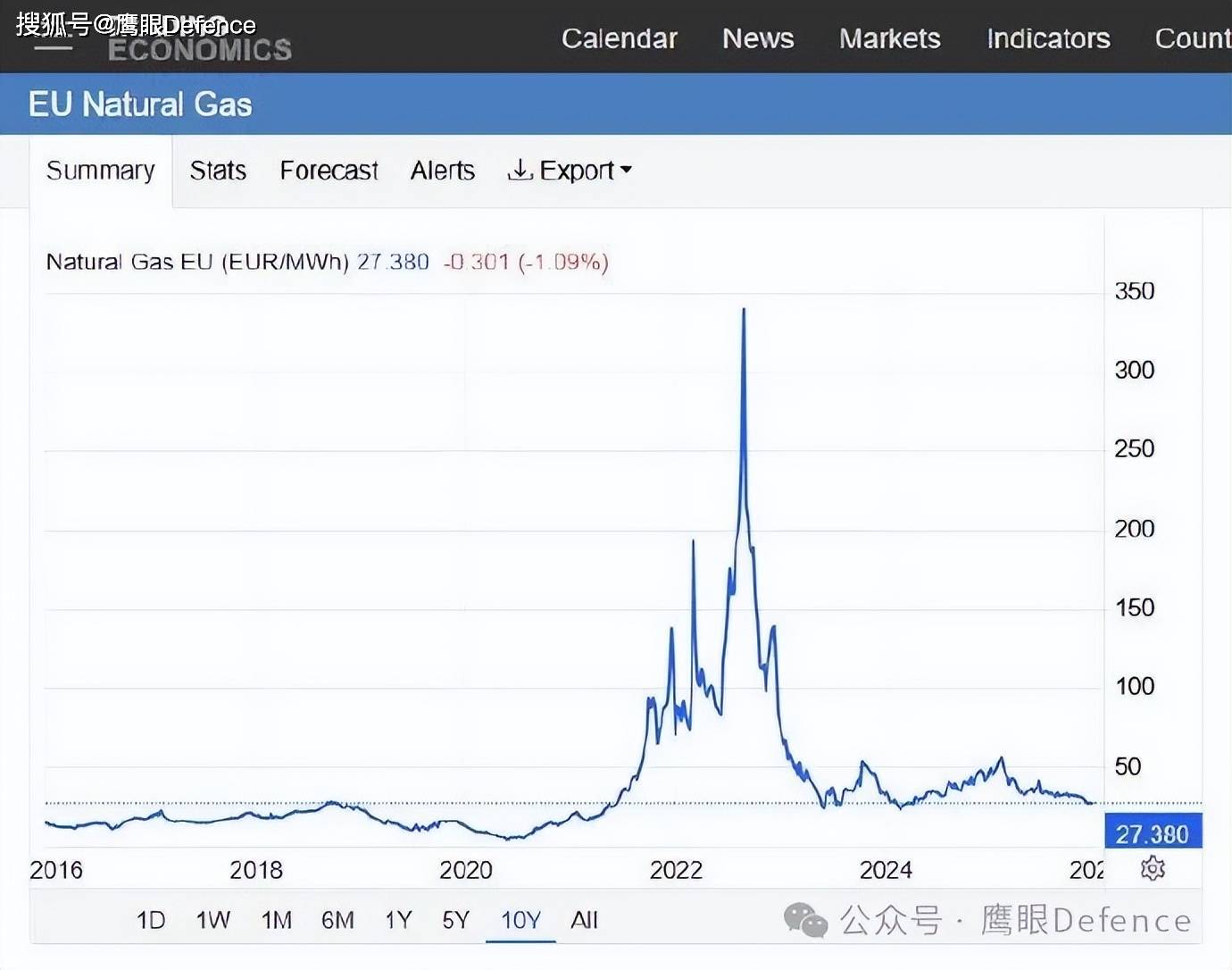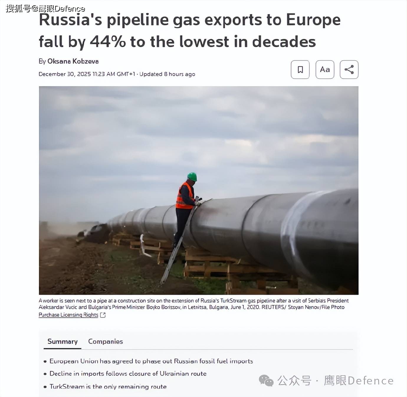 路透社报道显示,俄罗斯在2025年仅向欧洲出口了180亿立方米天然气,近50年来最低水平,远低于2018年到2019年期间高达1750亿立方米的峰值。