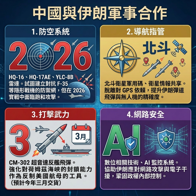 北京长期以来,一直是伊朗生存与军扩的“后勤总部”,军事合作大致可区分四大层面,包括:防空系统、导航指管、打击武力与网络安全等层面。 首先,在“防空系统”部分,中方提供HQ-16、HQ-17AE、YLC-8B 雷达,试图协助建立对抗 F-35 等隐形战机的防御网,但在 2026 实战中面临饱和攻击。