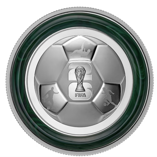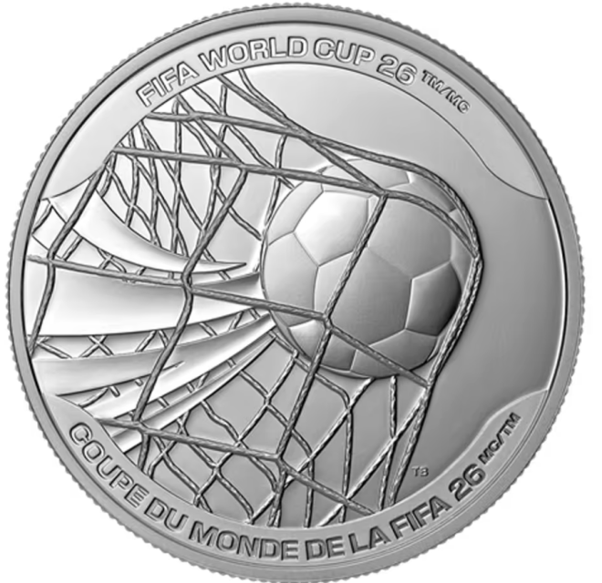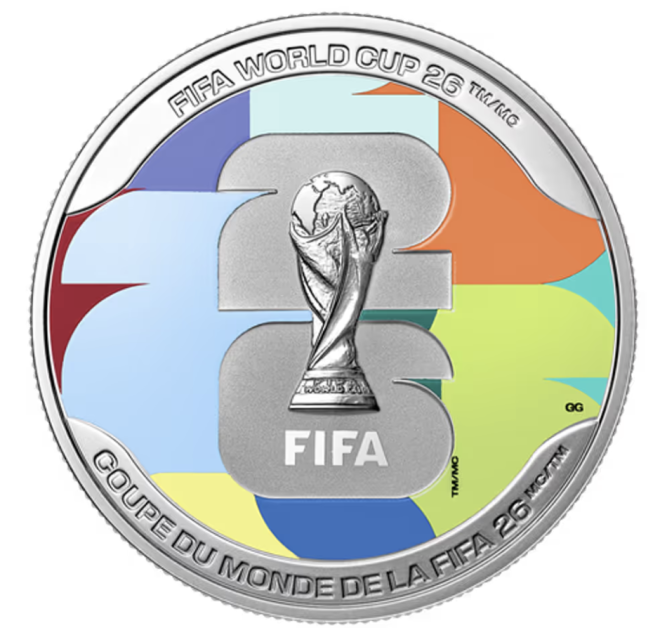 另一款 “26™”主题银币 售价 289.95加元,同样限量 11,000枚,设计象征着世界杯的活力、多样性以及加拿大、美国和墨西哥三国共同举办赛事的文化融合。