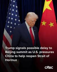 U.S. President Donald Trump threatened to delay his summit with Xi Jinping if Beijing doesn't help secure the Strait of Hormuz, as the U.S.-Israel war stifles oil supplies and unsettles ties between the world’s biggest economies.