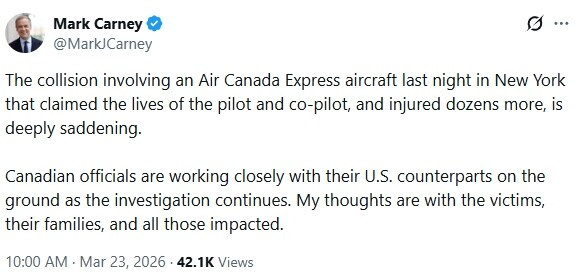 加拿大总理Mark Carney向遇难者、其家属以及所有受事故影响的人表示慰问。