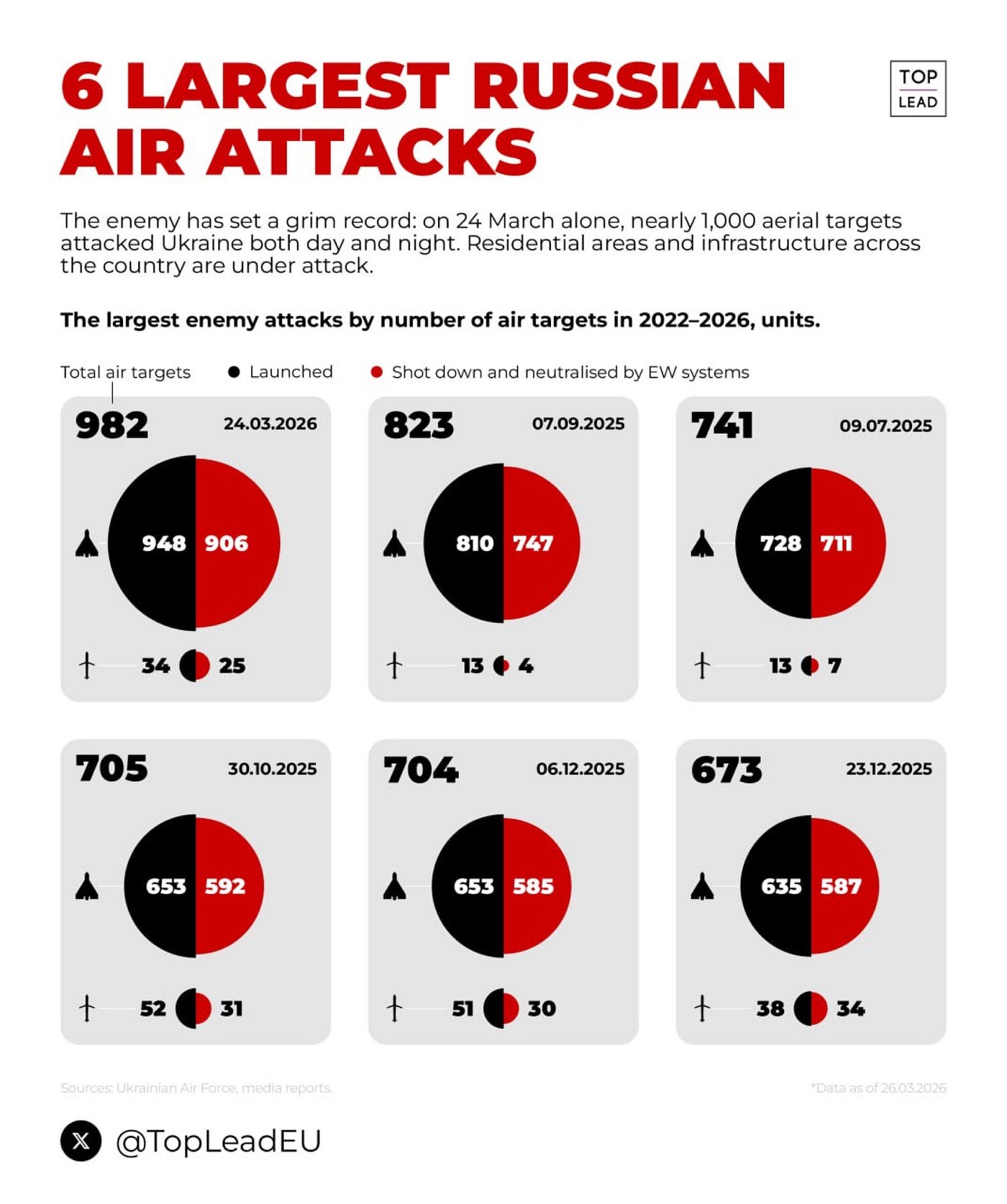 俄军在24小时内总共发射了982枚巡航弹,其中948架为无人机,另有34枚为其他类型的导弹。在此次袭击中乌克兰防空部队拦截成功率非常高,达到94.8%。