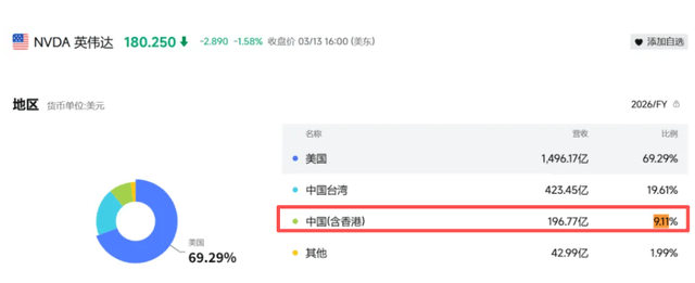 从上图可以看出来,英伟达在中国赚的这1360亿元,其实占英伟达的收入,还有9.11%,虽然与2021年的26.42%相比,跌了65%,但这个收入,已经很高了。