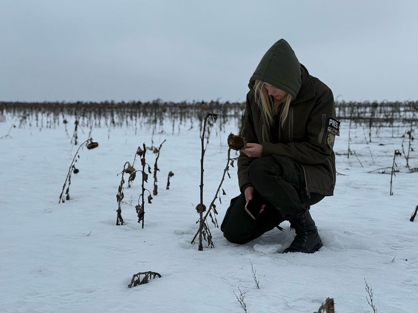 Alla while reporting with me from the abandoned sunflower fields of Donetsk, Ukraine – copyrighted photo