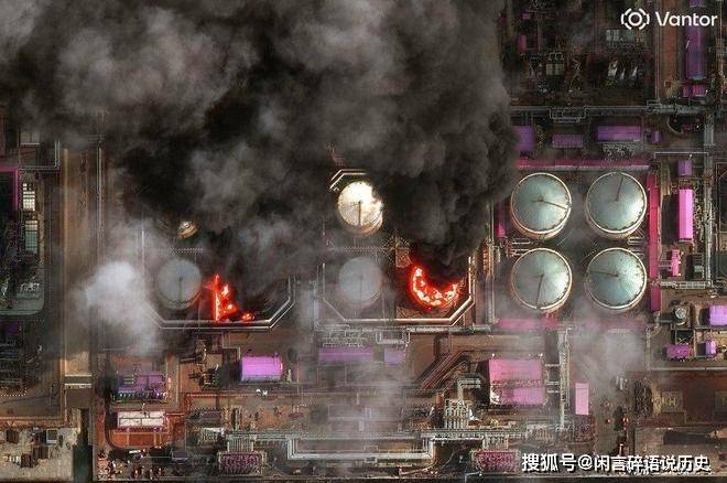 最新的卫星图像显示,该港口几乎所有的储油罐都燃起了大火,从空中可以俯视到耀眼的红光。