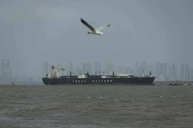 图为2026年4月1日,此前刚穿越霍尔木兹海峡的货轮Jag Vasant,停靠印度孟买港口进行液化石油气(LPG)转运。(Reuters)