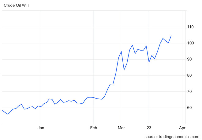 特朗普在4月2日就伊朗战争发表全国讲话后,油价又冲上每桶100美元以上。(trading economics)