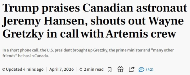 在阿尔忒弥斯二号飞船成功绕月后,美国总统特朗普周一与飞船乘组及加拿大航天员Jeremy Hansen通话并表达祝贺。这次简短通话中,特朗普还点名表扬了传奇冰球选手Wayne Gretzky,并出现了一分钟的尴尬静默。