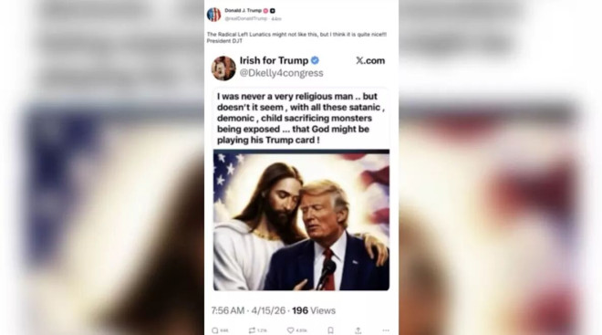 美国总统特朗普于社交平台转发一张自己与耶稣相拥的图片,引发争议后将帖文删除。
