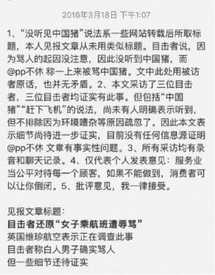 另一方面,值得注意的是,那位外国目击者也表示,自己并不能确认那个英国乘客有没有说出那句“中国猪”的话,因为她并没有听到整个冲突的全过程。此外,她也表示那个英国乘客因为人家换位子就跟人家闹是错误的,毕竟换座位这件事在那位外国目击者看来,也根本是很平常的事情。