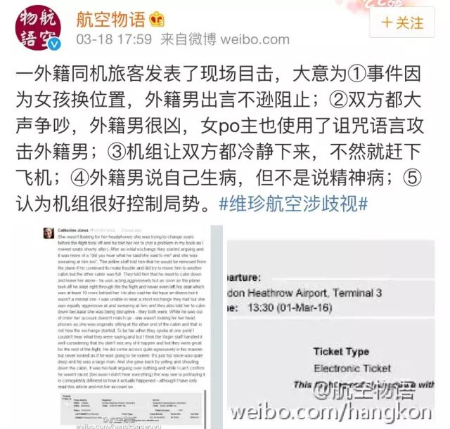 当时的实情是那个中国女孩被骂后,也在激烈地回骂,所以空乘让双方都冷静下来,否则就请他们下飞机的做法是合理的。 这位国外乘客还表示,这位女乘客确实是在更换座位,才引起那英国人出言不逊,而且那个英国人也不是像中国女乘客说的那样有“精神病”,但他确实身患疾病。此外,她距离那个骂她的英国人有10排的距离。而且维珍的空乘确实也尝试去前面的机舱找位置了,因为没找到才没给两人调整位置。