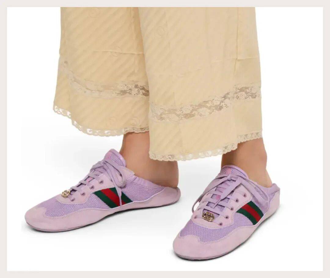 虽然好几个大牌在今年都在薄底鞋上发力,但Gucci的这双还是有很强辨识度的。织物鞋面,条纹织带以及复古贝壳头鞋型,再有着亚文化味很浓的品宣作为加持,很难不被年轻人和时髦人喜爱啊。