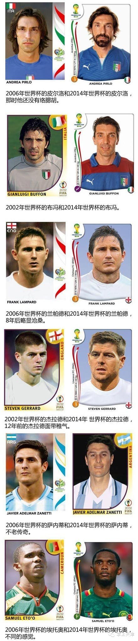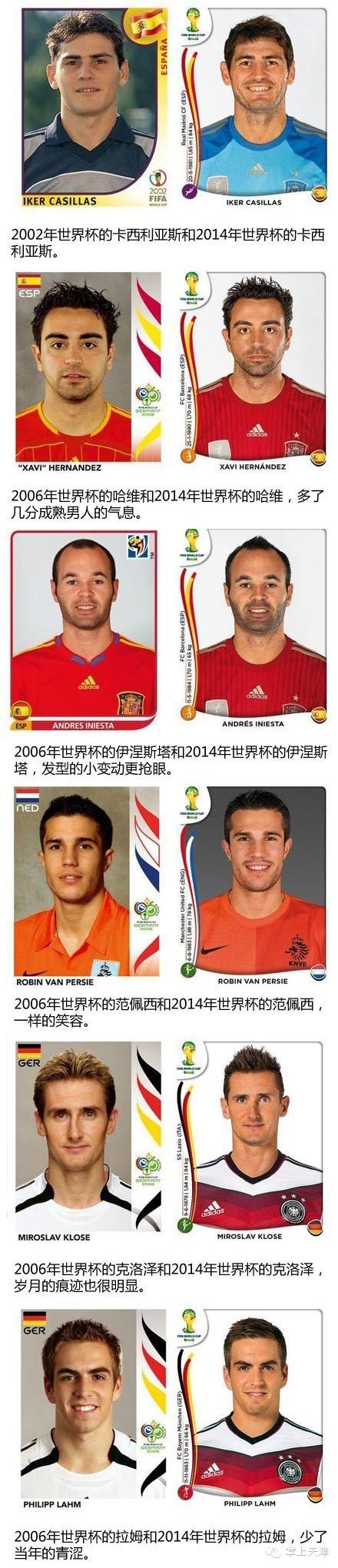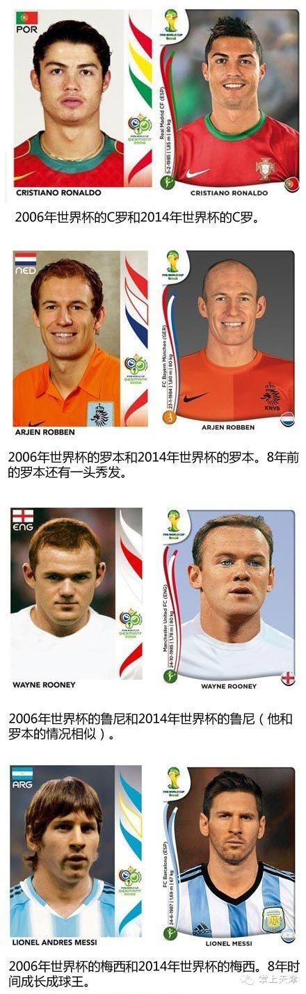 日前,国外媒体发布了2006(部分2002)世界杯和2014巴西世界杯球星对比图,C罗、梅西、罗本、鲁尼…昔日青涩的毛头小伙都蜕变成沧桑型男,不禁让人感叹:时间都去哪了?