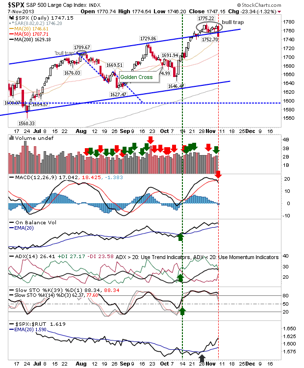 It looks like indices were doing their best to upstage Twitter's IPO. Both the S&P and Nasdaq closed with 'bull traps', threatening larger pullbacks. It will take a push above October's highs to knock out the 'bull traps', which may take a few days. What today offers is an opportunity for shorts to take a shot at a possible larger move lower.